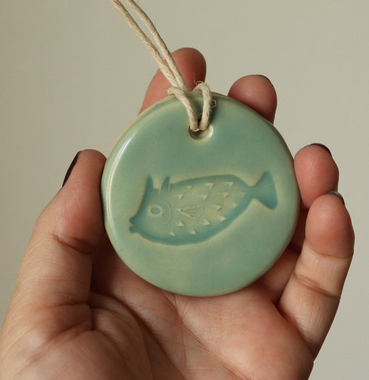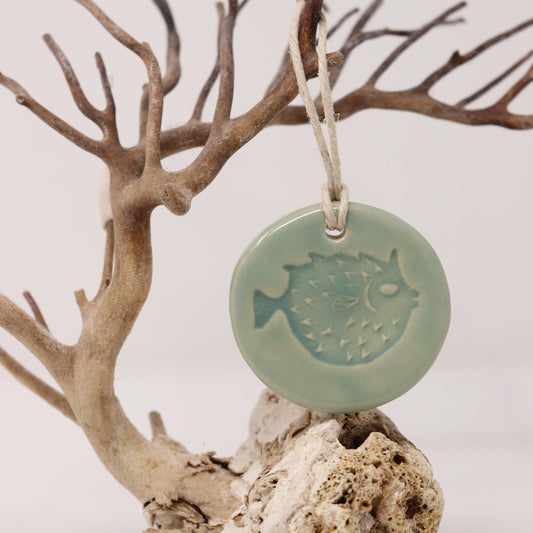 "Inhale" Aqua Pufferfish Handmade Ceramic Ornament