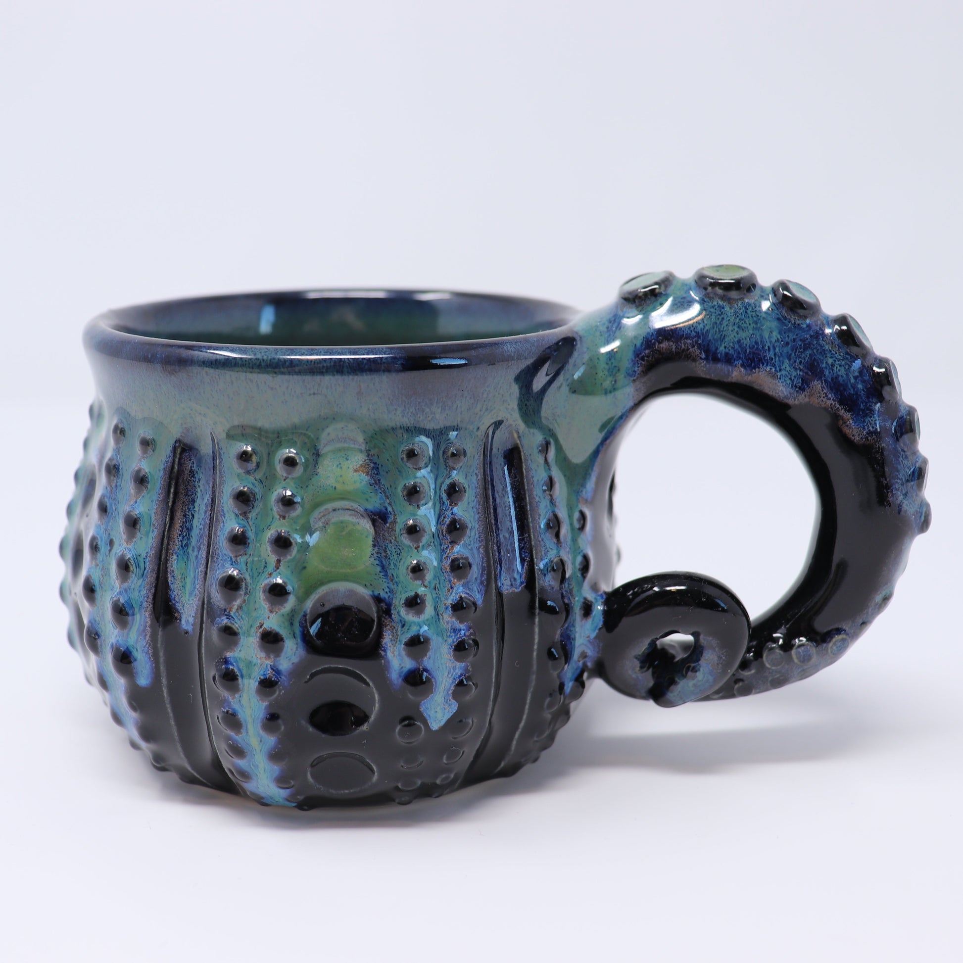 Unique, handmade, sea-themed mug full of texture, detail, and personality! The handle is shaped like an octopus tentacle and the cup is shaped like a sea-urchin shell. This clever, visually-stunning creation is also dishwasher and microwave safe!